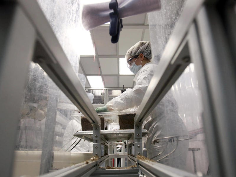 Workers at Ecovative inoculate mycelium into pasteurized bits of seed husks or plant stalks, then place the mix into clear plastic molds shaped like the desired packaging pieces, such as a cradle-shaped mold for a wine bottle. The mix is covered for about five days as millions of mycelium strands grow around and through the feedstock, acting as a kind of glue. The piece is heat dried to kill the fungus, insuring that mushrooms can't sprout from it. Since the mycelium is cloned, the product does not include spores, which can trigger allergies.