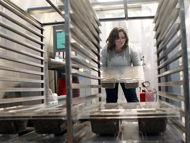 The company moved several years ago to a 10,000-square-foot facility in Green Island that still has the feel of a startup: an old industrial asparagus blancher pasteurizes the feedstock, and the mycelium is applied with a machine that once put chocolate chips on cookies. McIntyre's pet chinchilla, Audrey, rolls around the offices in a plastic pet ball.