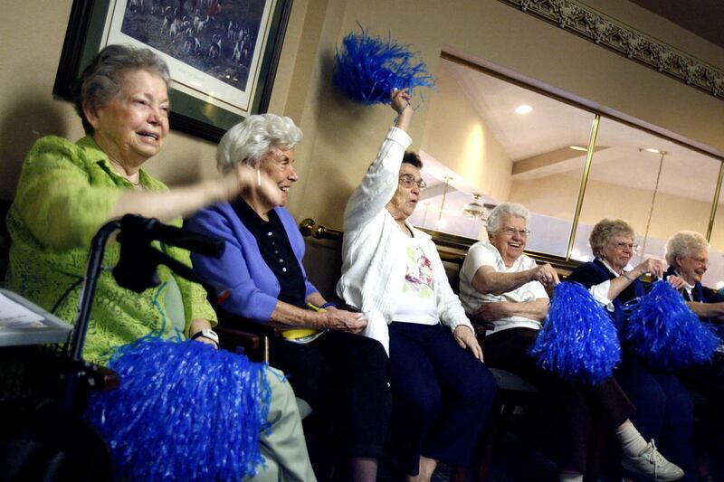 Amid the occasional dispatch crackle from a firefighter's radio, residents at the center shouted encouragement and dished out good natured trash talk while waving pompoms.
