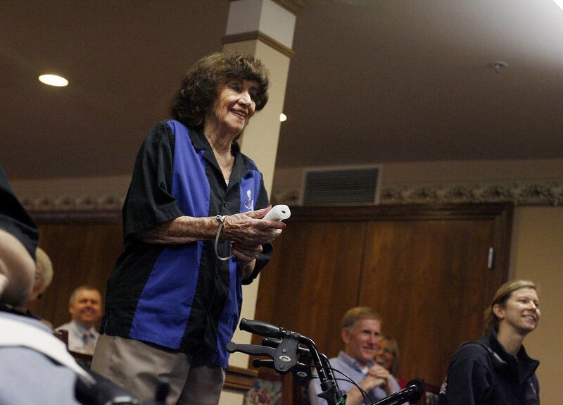 Doris Morley, 89, sidled into position with her walker and responded by rolling a virtual spare, resulting in another explosion of cheers from the crowd.