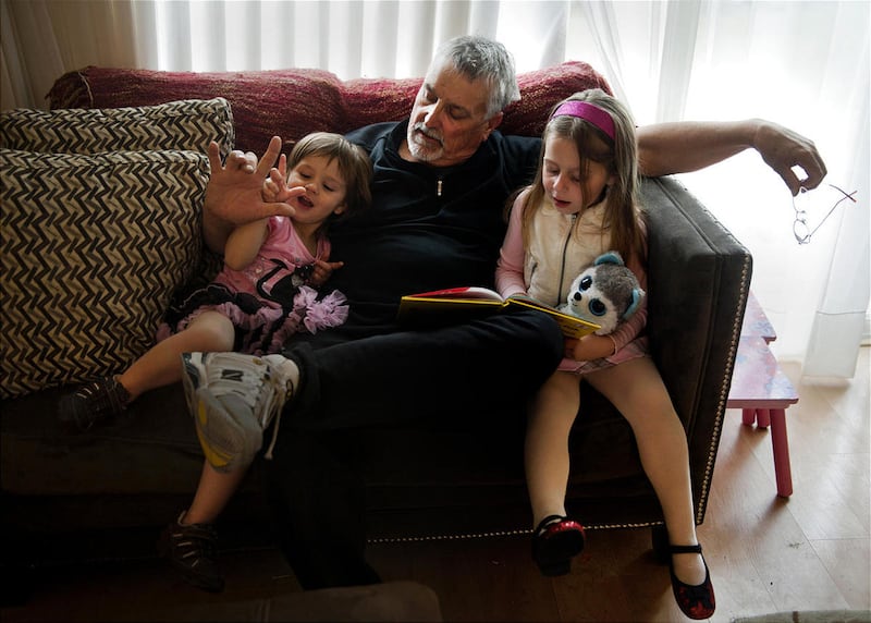 "Do you want to read a book?" he asked on a recent day. Eva and Ariel draped themselves across his lap, and, with his eyeglasses perched on his head, Hatfield launched into an animated rendition of "One Fish, Two Fish, Red Fish, Blue Fish" by Dr. Seuss.