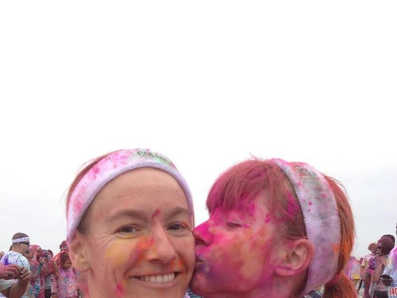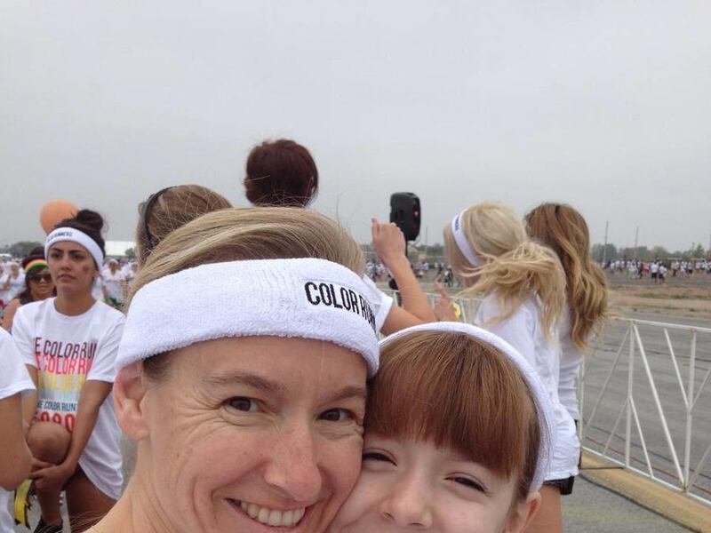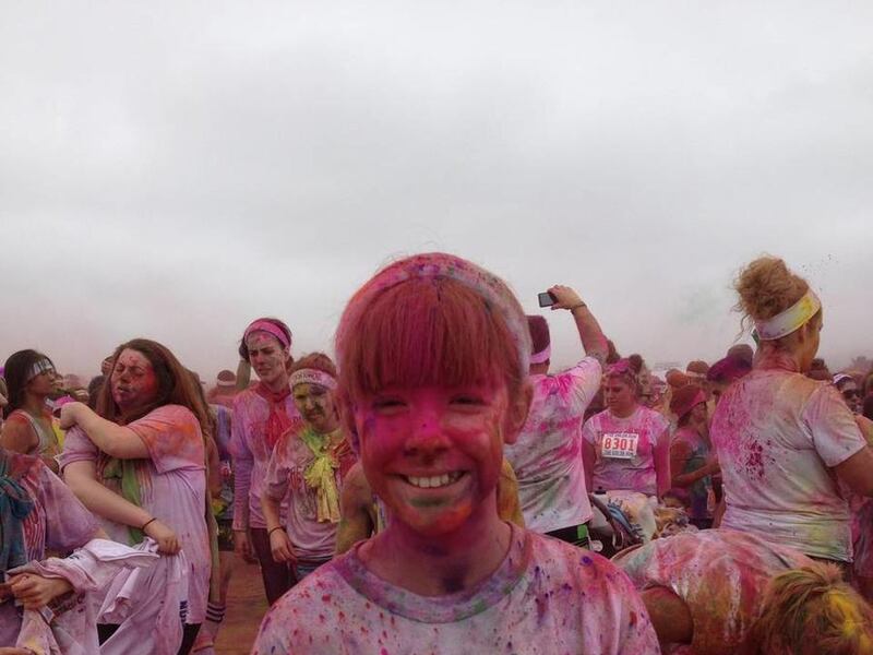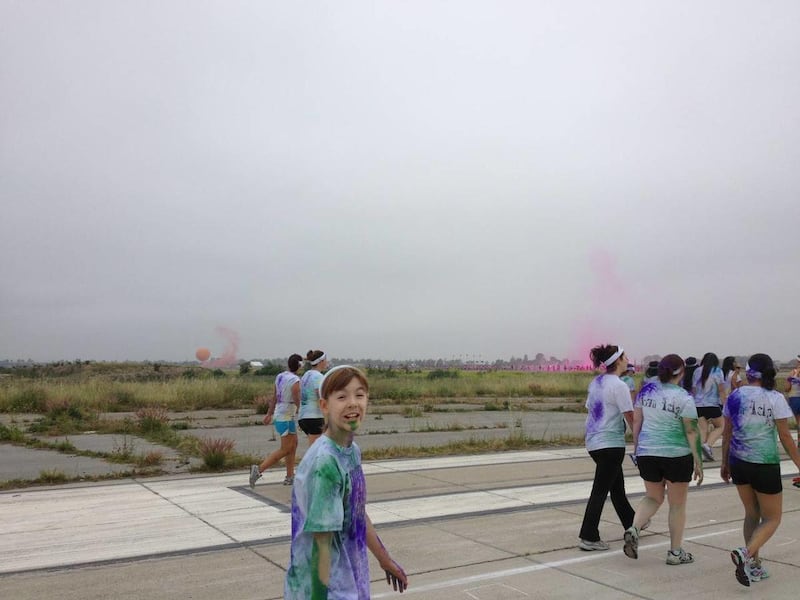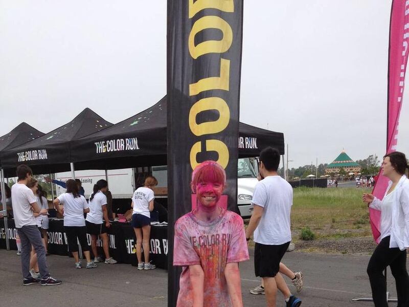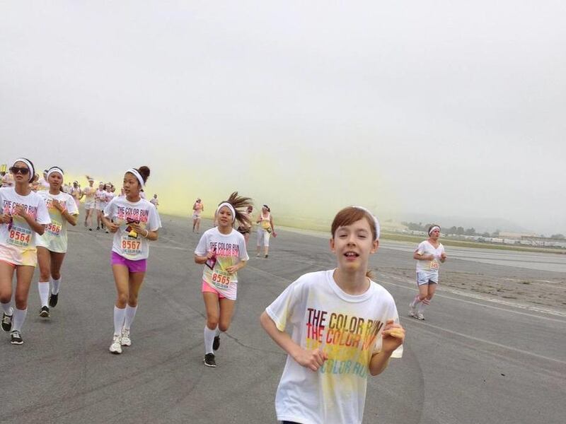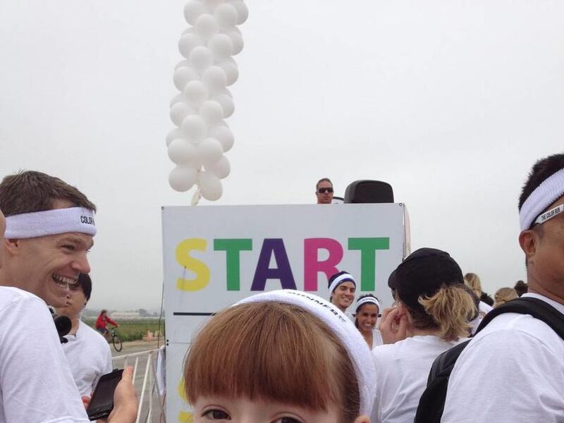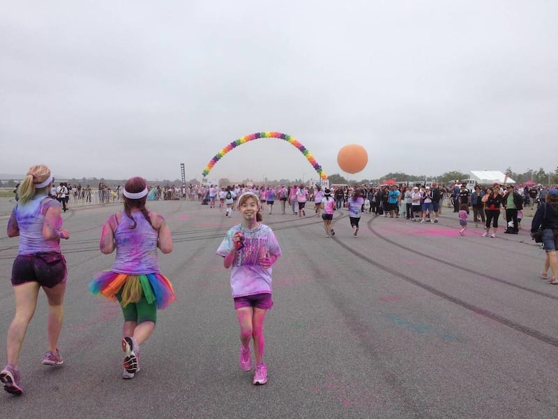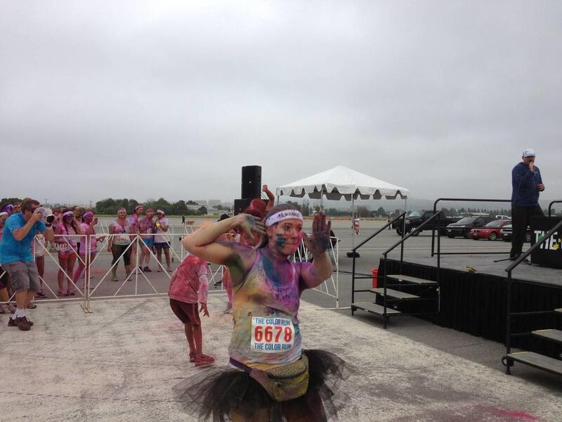 A Color Run is a 5K that starts in waves every 15 or 20 minutes, with color stations at each kilometer. At the one my daughter and I ran, yellow was first then green, pink and purple.