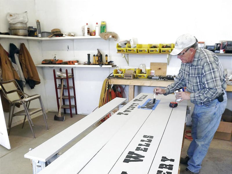 Anderson is busy applying paint and lettering to a sideboard that reads, "Twenty Wells Livery" — Twenty Wells being a pioneer-era name for the Grantsville area along the trail to California.