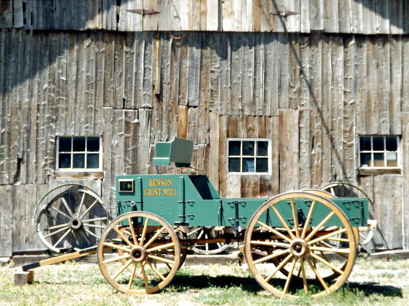 As part of that effort, members of the Benson Mill maintenance and restoration crew have become expert in resurrecting dilapidated wagons. Two sleek examples of their work sit among the site's out-buildings: a handsome green farm wagon and a buckboard with a high seat – a horse-drawn transport familiar from many a Western movie.