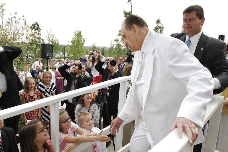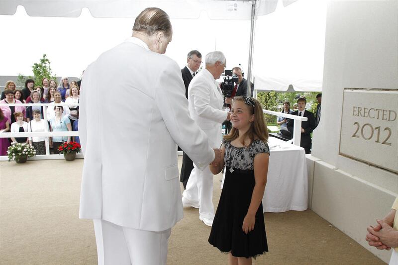 After the dedication ceremonies concluded Sunday afternoon, President Monson stopped to visit with people who lined the sidewalk in hopes of getting a chance to shake his hand. He talked with several of them and exchanged "high fives" with many young children.