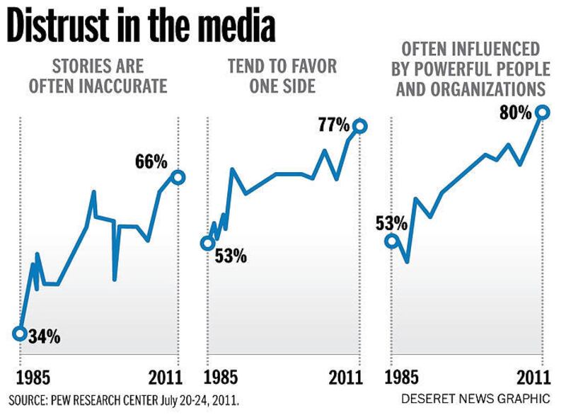 The Pew Research Center for the People & the Press has tracked views of press performance since 1985. Overall ratings are heavily negative, according to a 2011 study. The research shows that 66 percent of Americans say news stories are often inaccurate, 77 percent think news organizations tend to favor one side, and 80 percent say powerful people and organizations often influence news organizations.