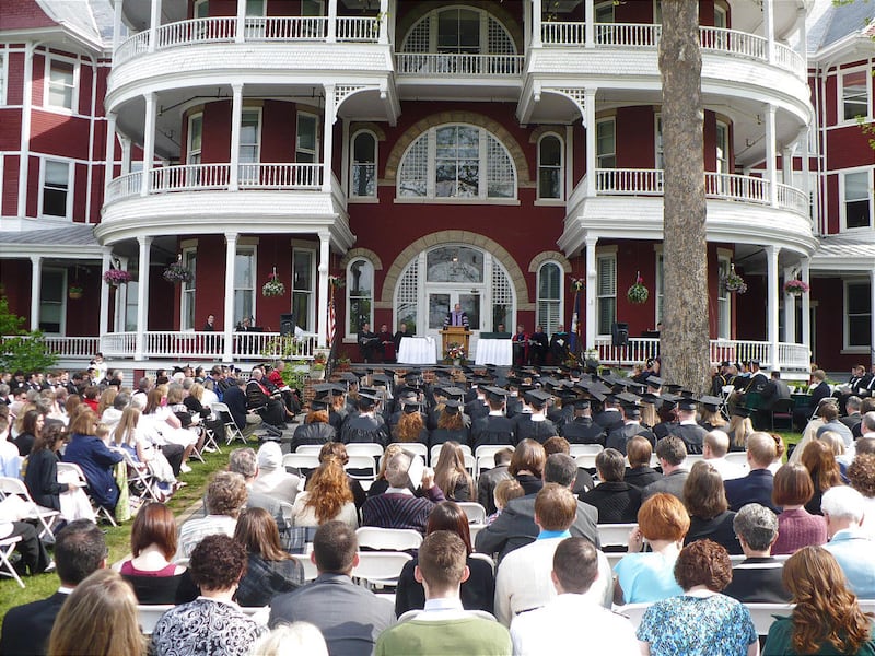 No matter how you say it, however, the Spanish translation of the name still applies: beautiful view. From the top of University Hill, where the college campus is located, one can look in any direction and see landscape thick with tall, green trees and gently rolling hills nestling quaint, picturesque communities and homes. Even University Hill itself is a beautiful view, dominated as it is by Main Hall, a handsome structure built in the 1890s as a grand resort hotel but transformed into what was then called Southern Seminary after the turn of the century.