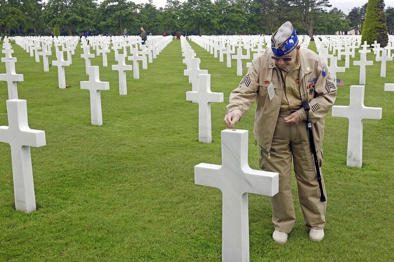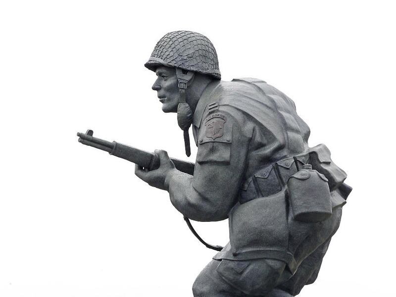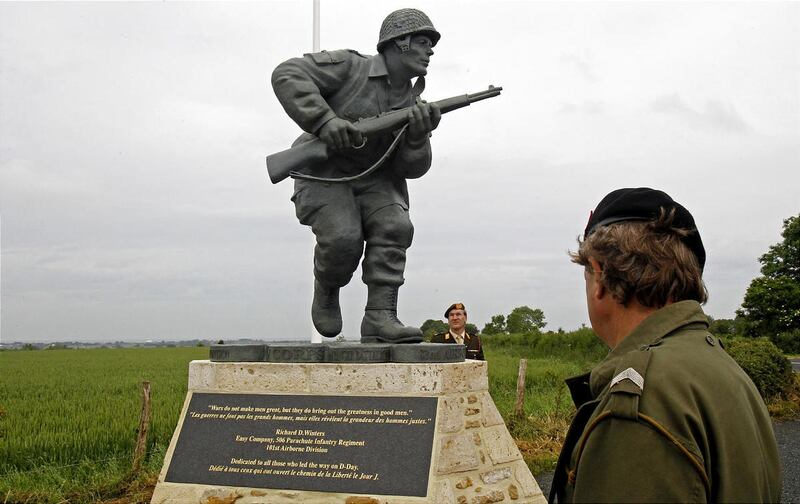 The 12-foot (3.6-meter) tall bronze statue in the Normandy village of Sainte-Marie-du-Mont shows Winters with his weapon at the ready. But Winters — a native of Ephrata, Pennsylvania, who died last year at age 92 — only accepted serving as the statue's likeness after monument planners agreed to dedicate it to the memory of all junior U.S. military officers who served that day.