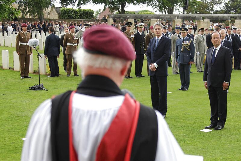 During the ceremony, World War II-era military aircraft flew overhead, including a U.S. artillery spotting plane just like those that would have darted through the skies on D-Day.