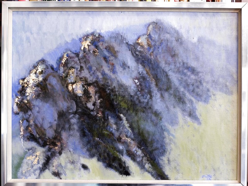 “I get attached to this work,” Hunt said, looking longingly at the subtle grey-blue and red flecked Snow painting propped up near her desk.
