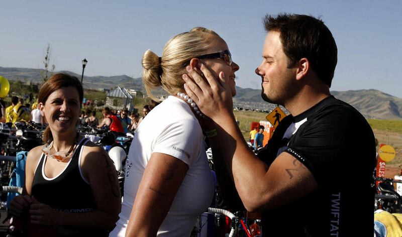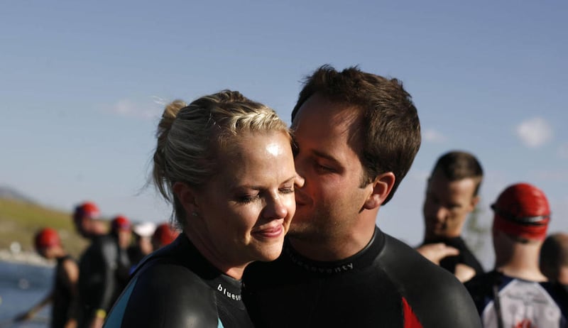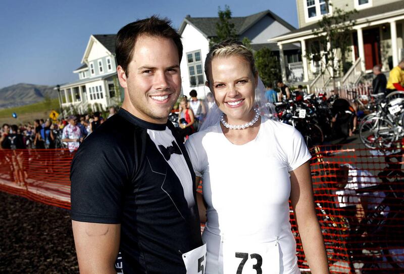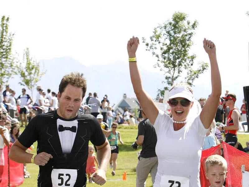 Together with close friends and family from the wedding party, the couple embarked on a 750 meter sprint swim, the 23.5K bike race and the 5K finish to the triathlon, all before the planned ceremony in the American Fork Amphitheater Saturday.