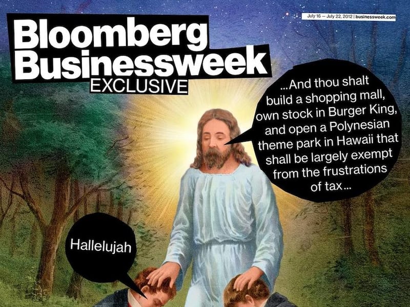 Two of the cover mock-ups used paintings of the First Vision. In these versions, cartoon text balloons have Jesus Christ commanding Joseph Smith to "open a Polynesian theme park which shalleth be largely exempt from tax" and God the Father telling him "… and then thou shalt build a shopping mall" and "invest in Burger King."