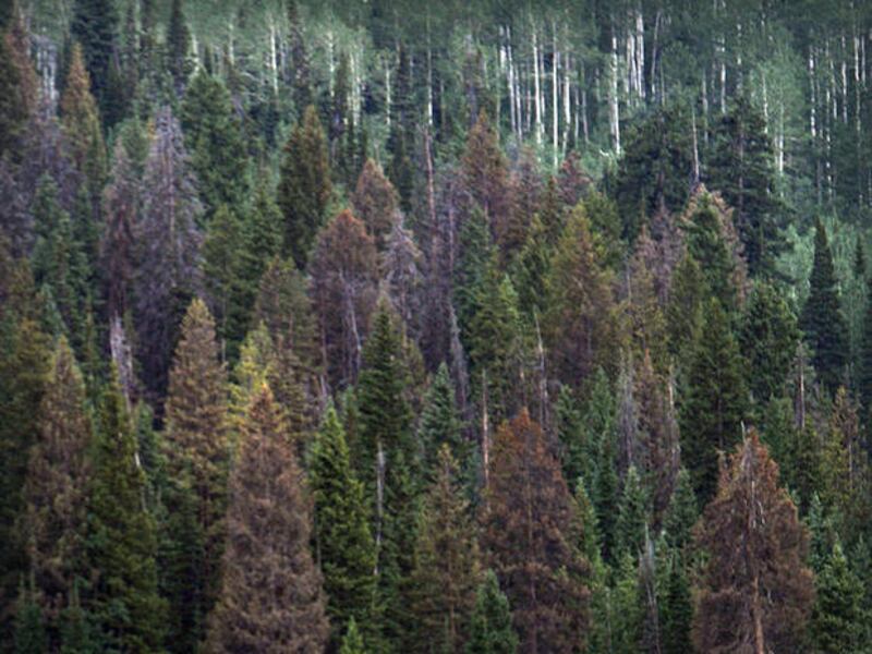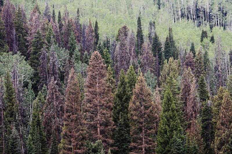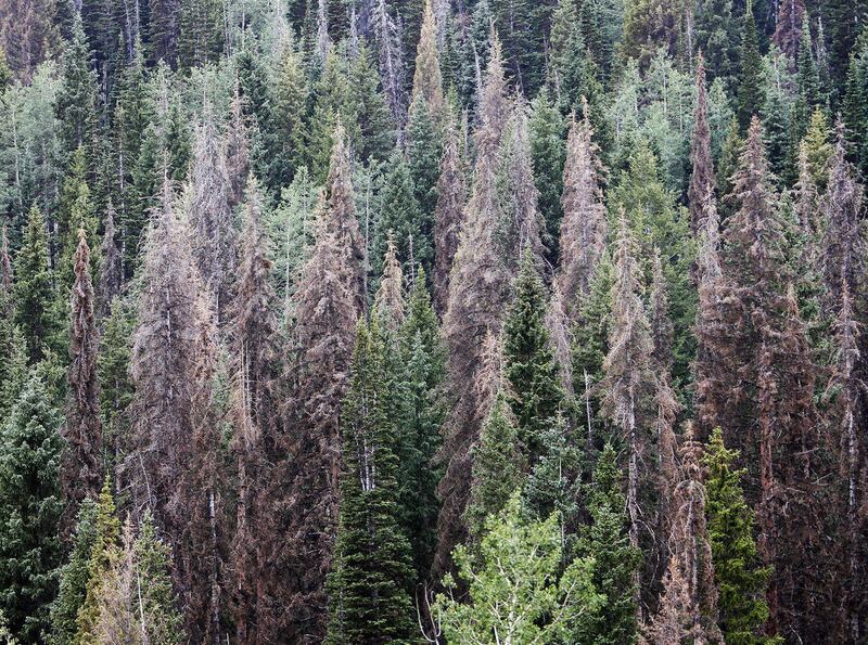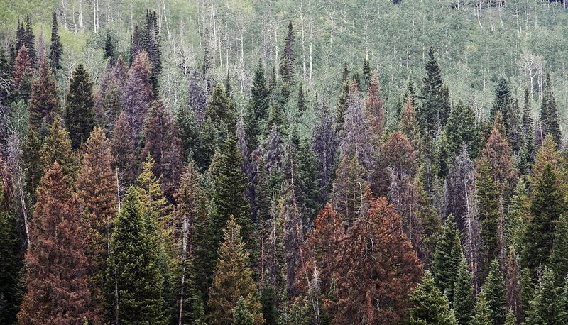 Blazzard is looking out over the high vista of Duchesne Ridge in the Uinta Mountains outside of Kamas, where great patches of dead or dying conifers have been turned brown by a relentless beetle infestation. The dead trees are literally a forest unto themselves, the devastation stretching out for miles.