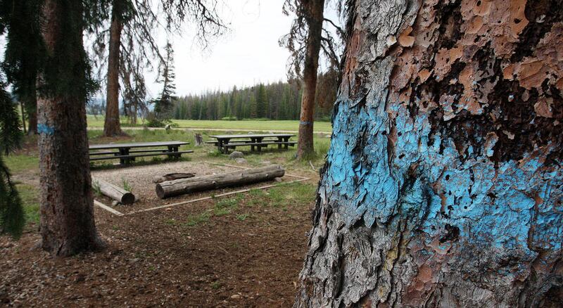 In another area, Blazzard gestures toward some campgrounds at Wolf Creek, where towering dead pines — some perhaps as old as 150 years — have been marked with blue paint. It is the Forest Service's signal for an upcoming timber sale being offered here and at the Trial Lake Campground.