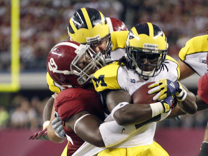 Even after sending three starting defenders from last year's national championship team to the NFL as first-round draft picks, the Crimson Tide threw around the Wolverines while stifling and pounding dual-threat quarterback Denard Robinson.