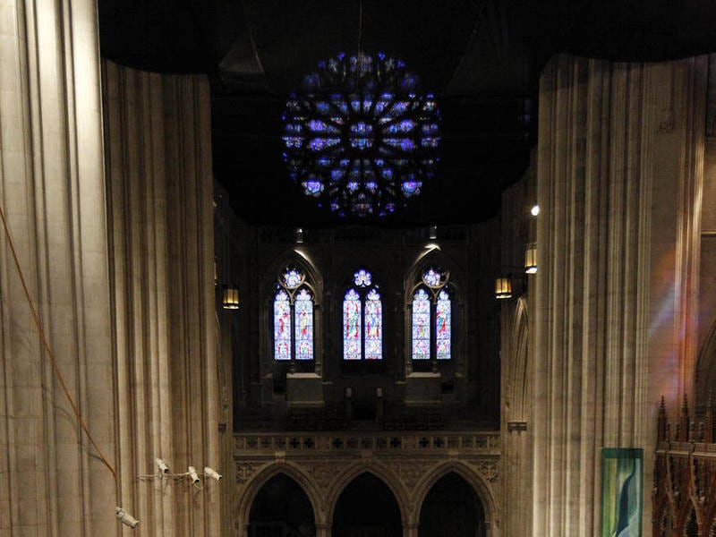 Apollo 11 crewmates Buzz Aldrin and Michael Collins and Mercury astronaut John Glenn were among the about 2,500 people in the cavernous cathedral. A moon rock that the Apollo 11 astronauts gave the church in 1974 is embedded in one of its stained glass windows.
