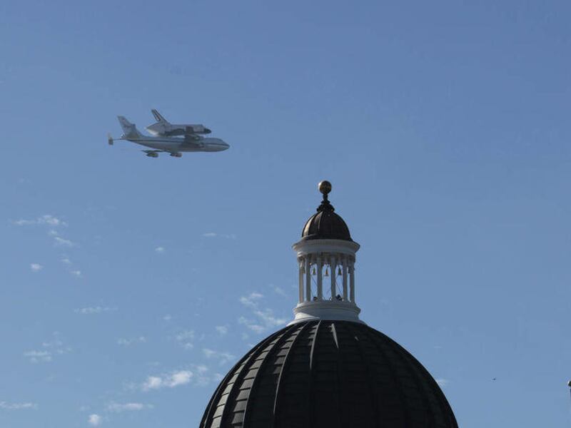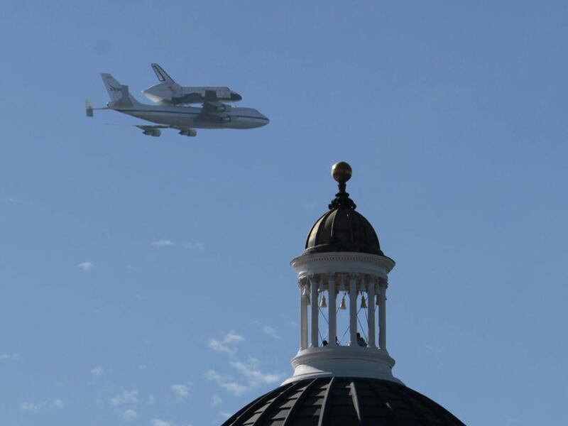 Hitching a ride on top of a jumbo jet, the pair departed Edwards Air Force Base, 100 miles north of Los Angeles, circling the high desert that gave birth to the shuttle fleet before heading to Northern California.
