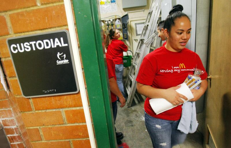 KEARNS — Red T-shirts surrounded Kearns Junior High School Friday as students joined several McDonald's employees in an effort to give custodial aid.