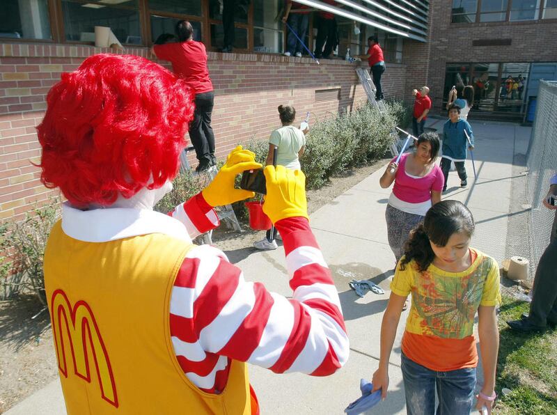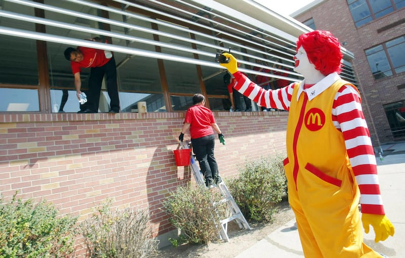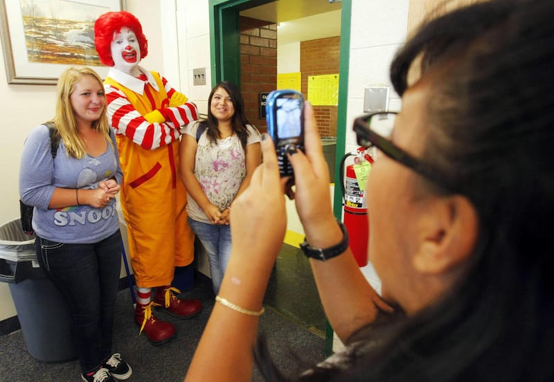 The employees split their day, working at McDonald's in the morning and then at the school for the second half of their shifts. Ronald McDonald provided smiles as he joined the rest of the McDonald's staff in support of the charitable activities.