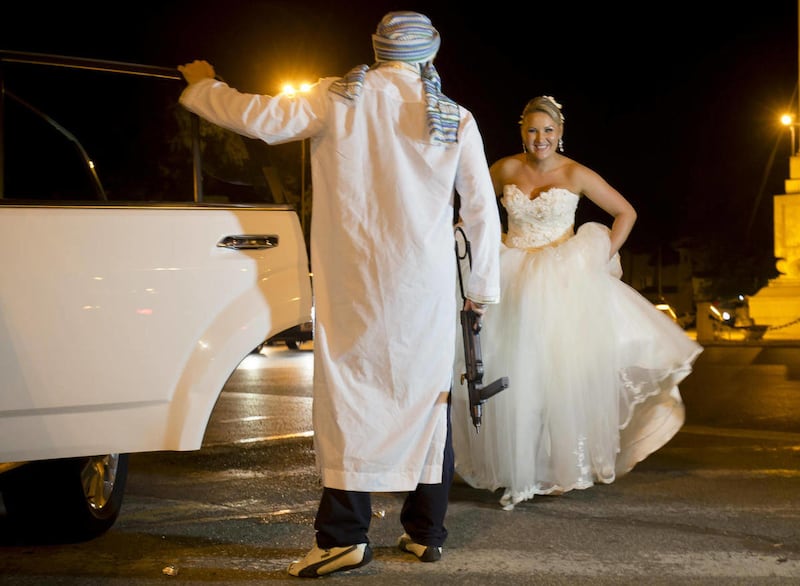 One bride was driven in from her wedding in a town an hour east of Bucharest with a gaggle of guests in tow. Another grabbed the toy machine gun of her kidnappers, dressed up as Taliban, and pretending to use it in front of the monument.