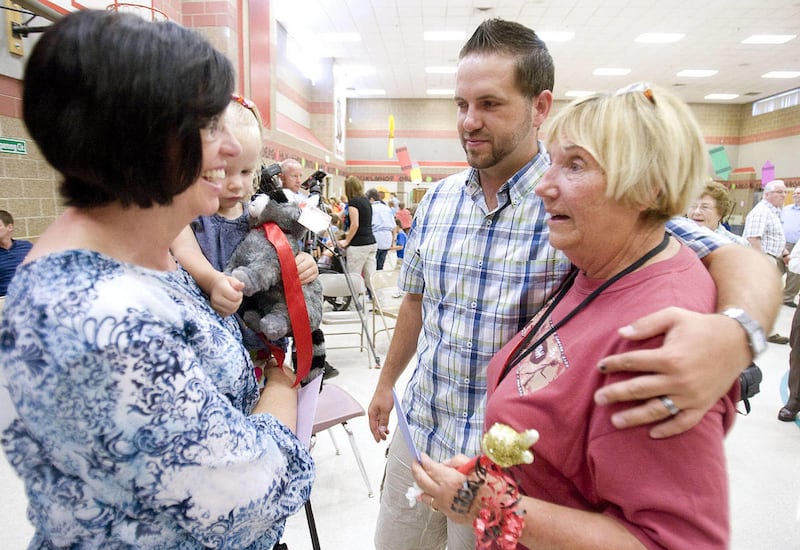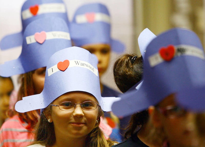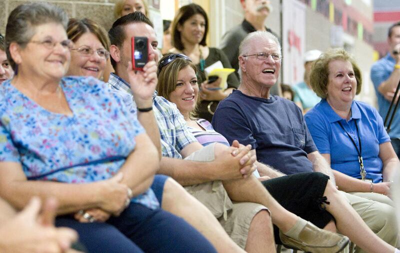 Warwood appeared stunned as she paraded her class into the room of cheering students, live bagpipe music and camera flashes. She paused for only one hug as she made sure the 5- and 6-year-olds in her care were accounted for and seated in orderly rows.