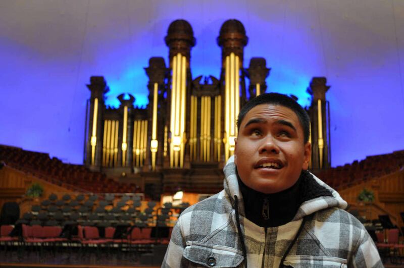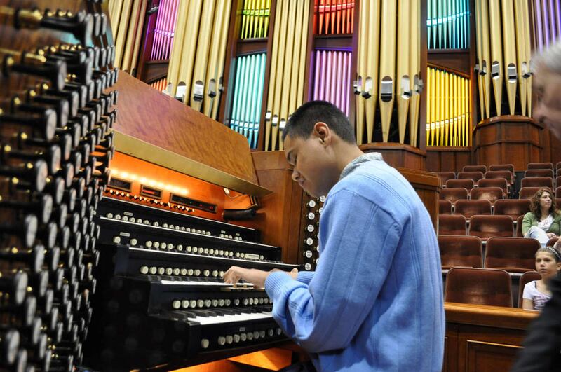 While visiting Utah in April, Kuha'o Kawaauhau-Case plays the organ in the Tabernacle on Temple Square. He also visited the Conference Center and met Richard Elliott, one of the Tabernacle organists.