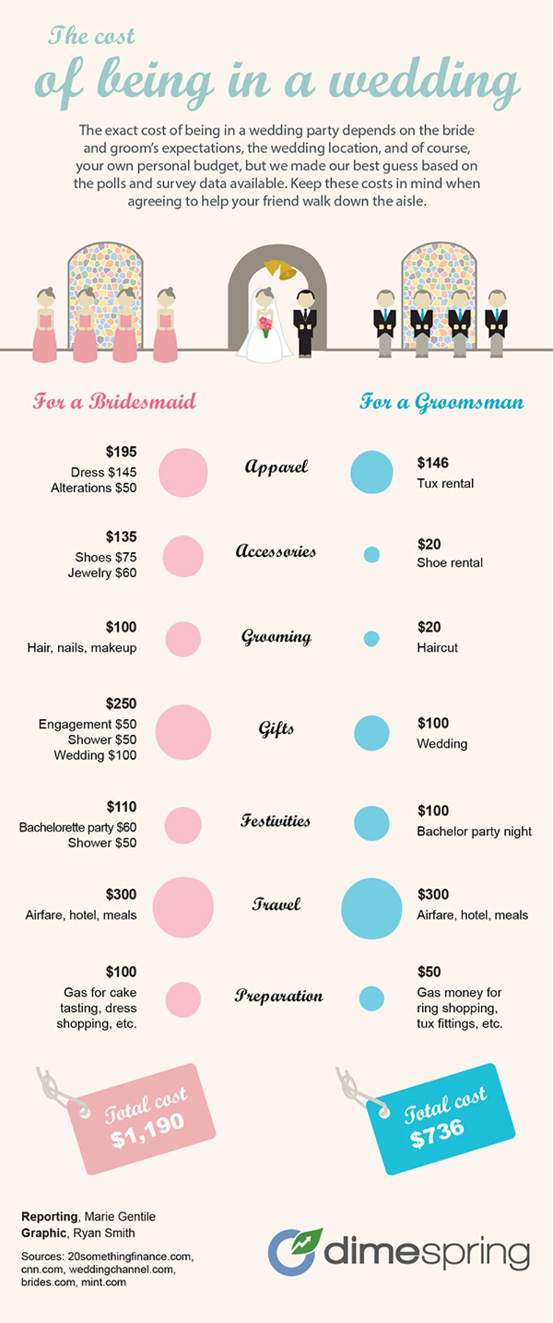 This chart from Dimespring shows how much you can expect to pay if you're asked to be a bridesmaid or groomsman.