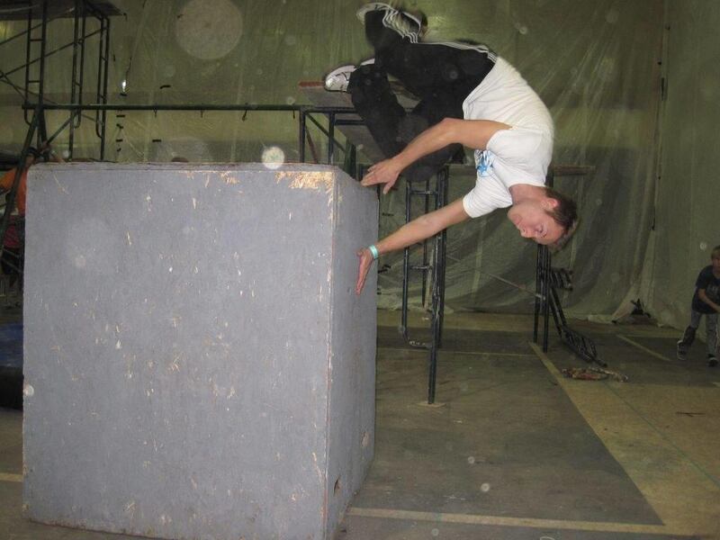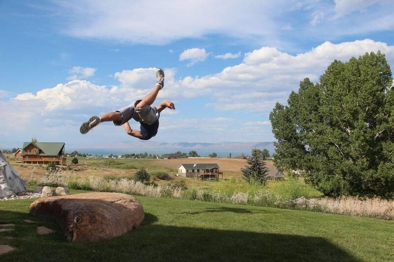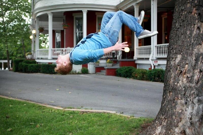 He presses his sweaty palms against his bright red T-shirt and hurls into a front flip. His friends shout praises from above, but then the searing pain shooting through his body indicates that he has landed wrong.