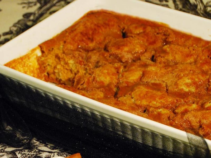 Pat into the bottom of a 9-by-13 baking pan. Mix together four eggs, pumpkin, sugar, salt, cinnamon, cloves, nutmeg and evaporated milk.