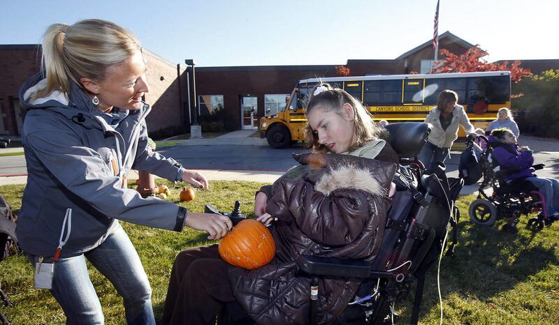 Marley and about 155 other students with severe disabilities got to wander through a makeshift pumpkin patch Monday to choose a pumpkin grown and donated by inmates at the Utah State Prison.