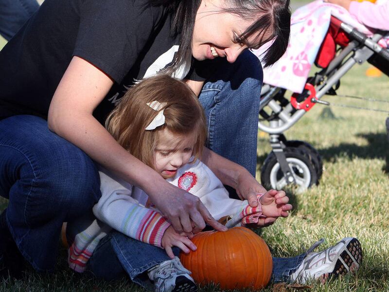 MIDVALE — Five-year-old Marley Eliason sat and rolled a pumpkin back and forth with her mother, Jana, on the front lawn of Jordan Valley School.