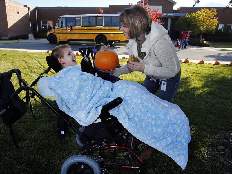 Many students were led by the hand or pushed around in wheelchairs by teachers and teachers’ aides like Cari Curtis, who has worked at Jordan Valley School for seven years.