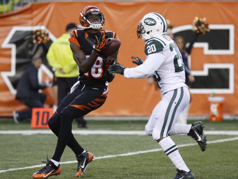 —Cincinnati's Marvin Jones, a second-year wideout from California who previously had 16 catches this year and all of 18 in 2012, and Bengals star A.J. Green. Jones made eight catches for 122 yards and scored four touchdowns in a 49-9 rout of the Jets. The four TD catches are the most in a single game in Bengals history and the most in an NFL game since Nov. 18, 2007, when Randy Moss and Terrell Owens each had four.