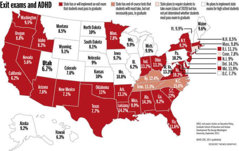 As Hinshaw and Scheffler looked at the numbers they noticed an interesting pattern: states with high school exit exams (tests students must take as a condition for graduation), also tended to have above-average rates of ADHD. “In these states, you don’t get a diploma unless you can show you’ve mastered certain material,” Hinshaw said. The stakes are high for students: “fail the test and you won’t make it to college,” Hinshaw said.