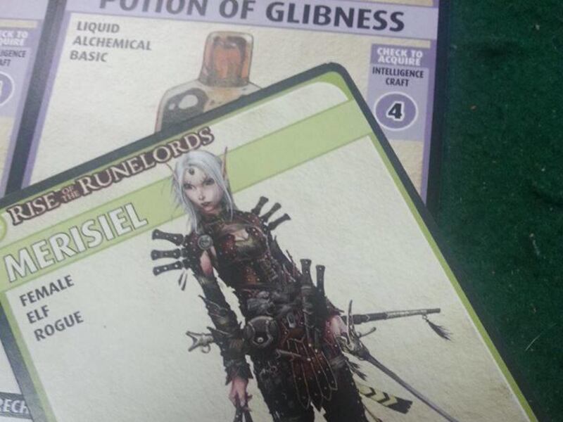 Each player carries a certain amount of cards from different decks, which include weapons, armor, allies and spells, and each has certain stats placed on an information card in front of him. A token card can then move from location deck to location deck, laid out before the players.
