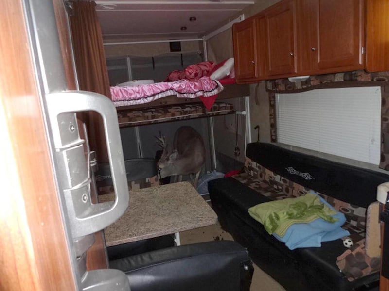 "The second the camera flashed, the deer turns toward me, his eyes are kind of big, looks toward me, tilts his head down and antlers first comes running out of the back of the trailer full tilt toward me," Evans said. "I kind of let out a little high-pitched scream because I'm between the deer and door. I jump out of the door and run toward the back of the trailer."