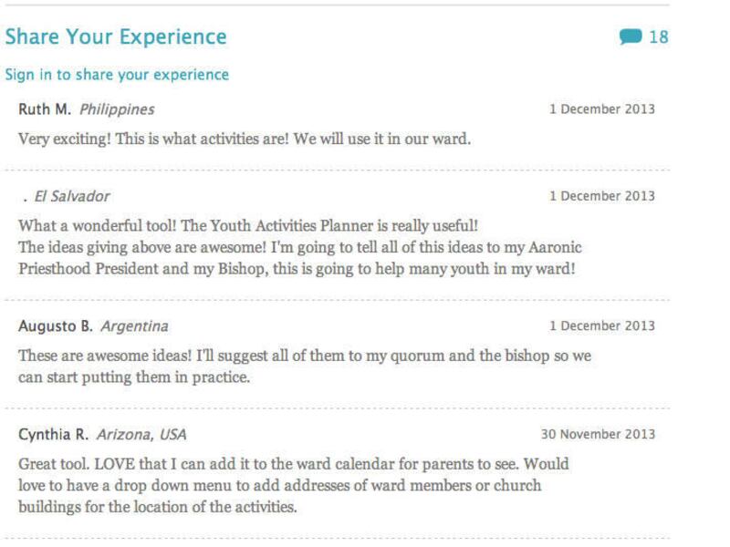 Navigating the website is easy. Visitors can search for activities by typing in their own key words or selecting activities based on categories such as service, missionary work, sports, camping, arts, music, dance and many others. The site even offers the ability for wards and stakes around the world to submit their own activities. Users can also leave comments about activities. Elder Stanley G. Ellis of the Seventy said, "The activity ideas on this website were written to be adaptable to a variety of local circumstances. However, we recognize that many of the good ideas for activities are out there in the wards and branches around the world — the things you've tried and found successful. We encourage youth and leaders to share your good ideas on the site. Tell us about activities you've held that have really strengthened the youth. That's how this site will become a rich, inspiring resource for the international church."