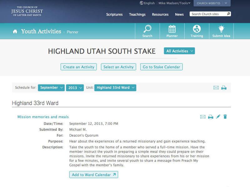 The new website also allows leaders to see what activities the young men and young women in their ward or stake are planning. For example a bishop can log into the site and see what the Mia Maids are doing for the month of January and the site will show exactly what the activity is and when it is happening.
