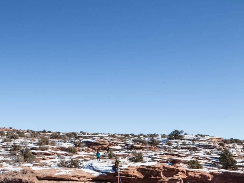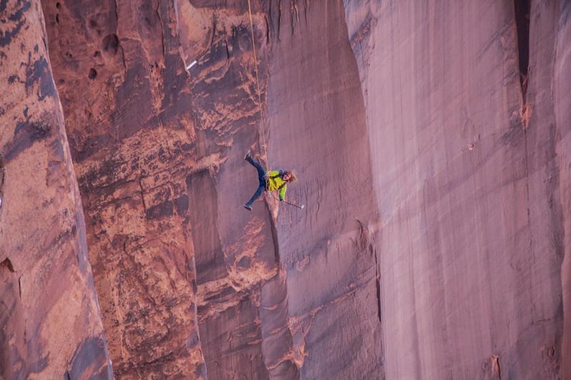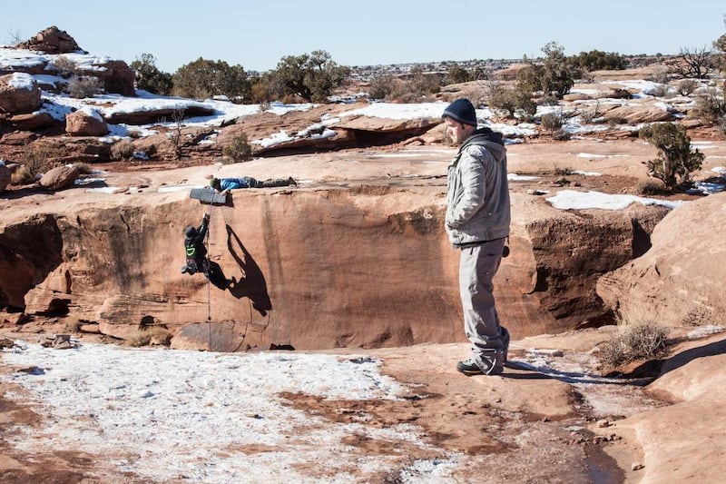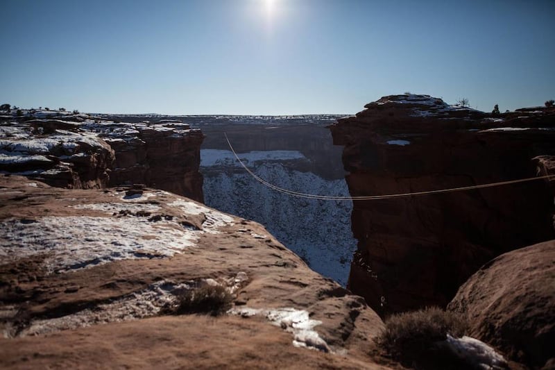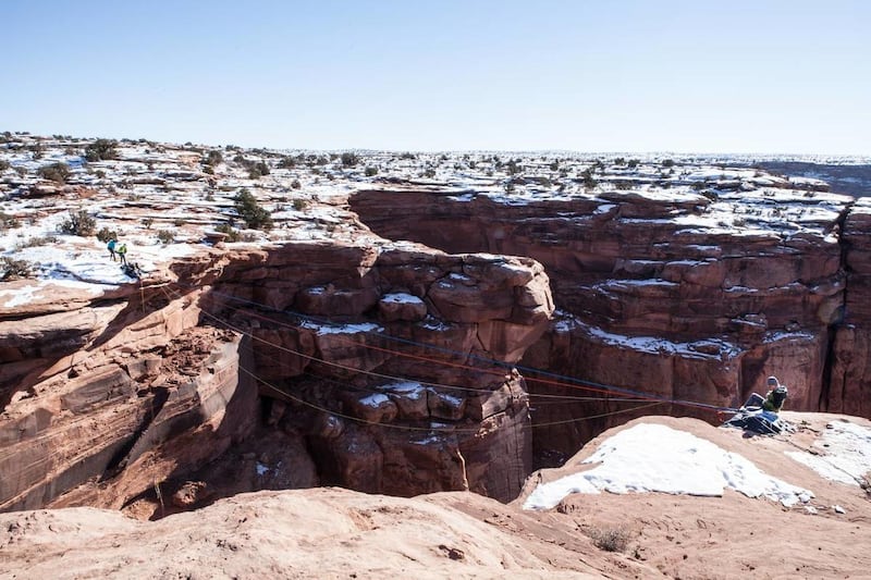 Creighton Baird, whom you might recognize from the first "Arches Rope Swing" video (you see him in the video shooting the rope across the canyon with a bow and arrow), helped set up the swing. He told me they used the location previously to slackline, a sport kind of like tightrope walking between cliffs and high areas. They introduced Graham to the area for use in one of his future videos.
