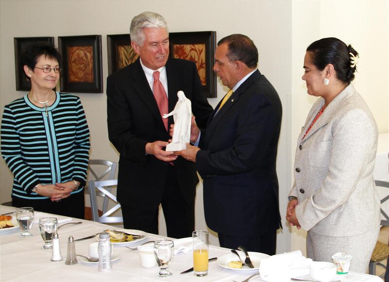 On Friday, President Uchtdorf hosted a breakfast at the Tegucigalpa temple offices for Honduran president Porfirio Lobo and the First Lady, Rosa Elena de Lobo. The two men exchanged gifts and discussed the new temple and the LDS Church's growing presence in Honduras.