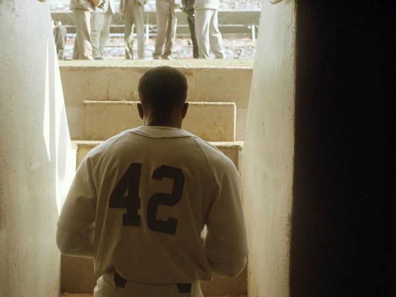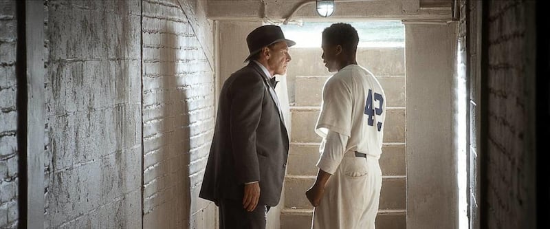In “42” (the film's title refers to Robinson's jersey number), the plot begins in 1945 as Branch Rickey pontificates to his assistant that he wants to bring a black player to the big leagues. An exhaustive search for the best baseball players in the Negro Leagues yields Jack Roosevelt “Jackie” Robinson, shortstop for the Kansas City Monarchs. In addition to his obvious physical talent, Robinson appeals to Rickey for his leadership qualities (Robinson was an officer in the U.S. Army during World War II) and experience competing alongside white athletes (he lettered in four sports at UCLA — baseball, football, basketball and track & field).
