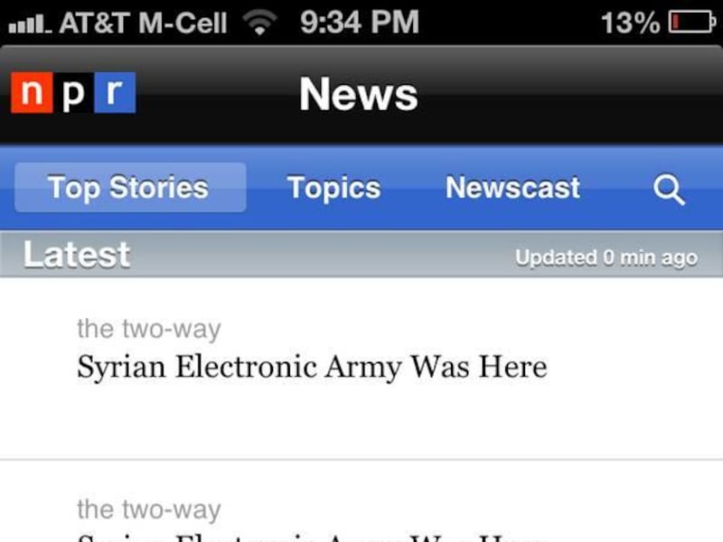"Late Monday evening, several stories on the NPR website were defaced with headlines and text that said Syrian Electronic Army Was Here.' Some of these stories were distributed to and appeared on NPR member station websites," the statement said. "We have made the necessary corrections to those stories on NPR.org and are continuing to work with our Member Stations. Similar statements were posted on several NPR Twitter accounts. Those Twitter accounts have been addressed. We are closely monitoring the situation."