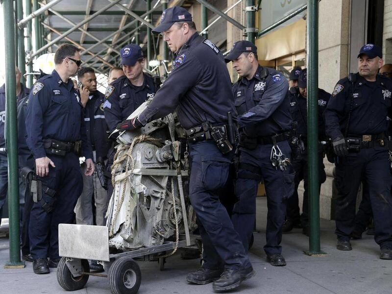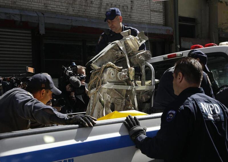 NEW YORK — Using a pulley system and sheer brawn, police removed a suspected 9/11 plane part from between two buildings near the World Trade Center site, and the medical examiner said no potential human remains had been found there.