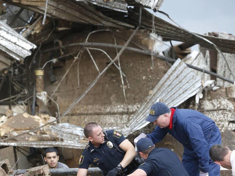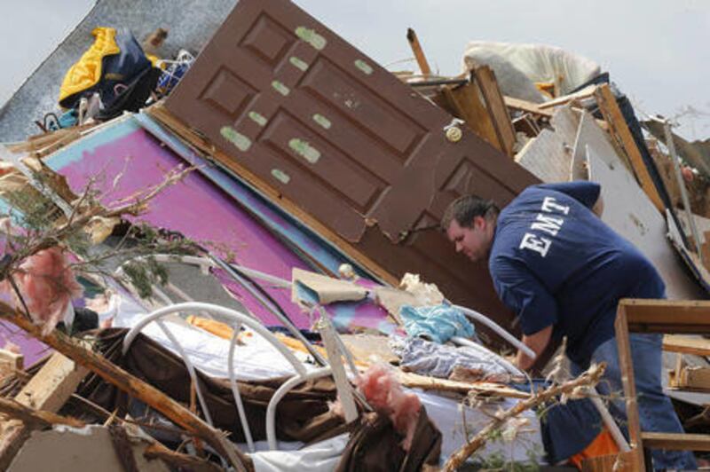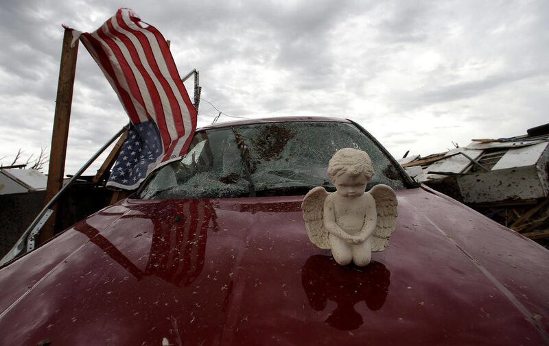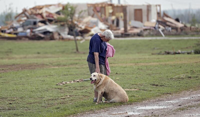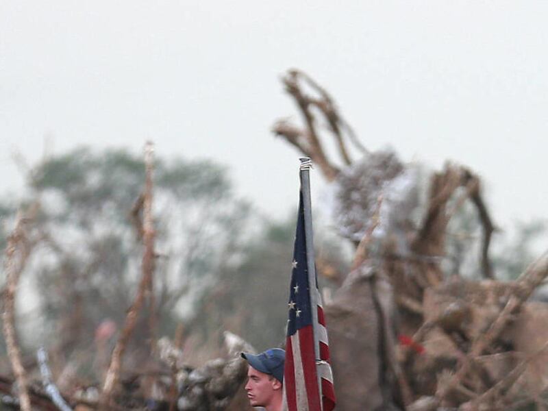 The Garlands dug through the rubble for the safe, which had been ripped from the concrete floor, but was intact. As Rebecca Garland stood in the rain, wearing a pink Oklahoma University T-shirt and Oklahoma City Thunder basketball cap given to her by a stranger, Max emerged from around the pile with a sodden Tin Man doll — part of her once extensive "Wizard of Oz" collection.