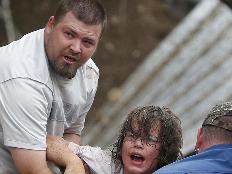 Shelton hugged his wife and son in mute relief. The Garlands' home was gone but for a tiny section of the front wall; the storm had ripped the vent covers from the shelter, but could not gain entry.