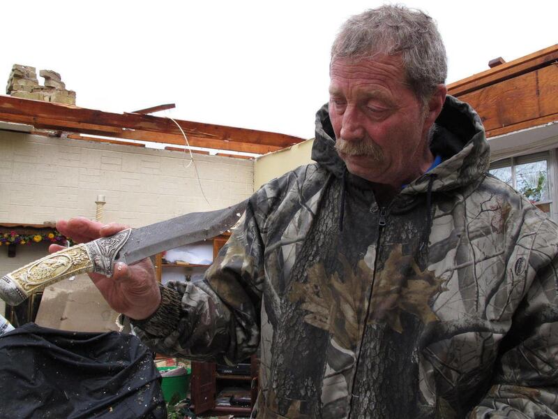 Picking through the rubble, his son, Kevin Metz, finds a wall clock, its hands frozen at 3:15. After some more digging, Osmus finds one of his most treasured possessions — a menacing-looking Bowie knife with an eagle's head carved into the ivory handle, a gift from a Marine pal.