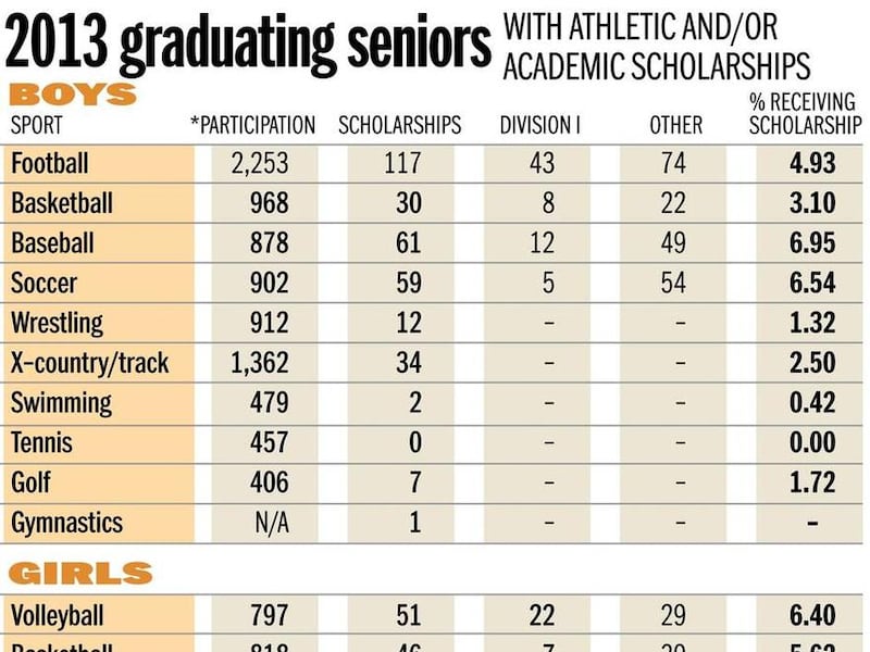 As for girls’ soccer, even though the percentage of athletes who received scholarships was down slightly from 10.6 in 2012 to 9.9 in 2013, there are still 82 girls who received soccer scholarships.