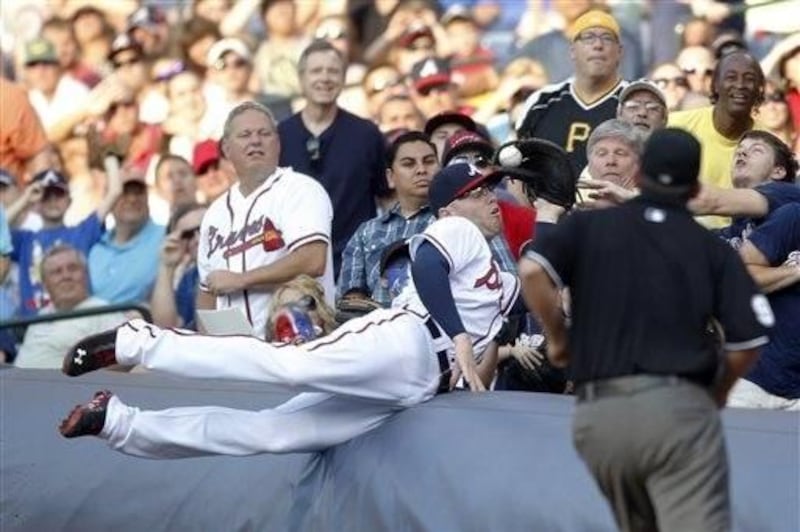 — Ditto for Braves first baseman Freddie Freeman. His attempt to field a foul ball was successful, and it resulted in an unintentional interaction with the fans who, hopefully, were aware of the danger that comes with front-row tickets.