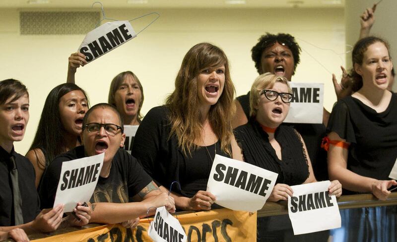 The signing ceremony was moved from Perry's office on the second floor of the Capitol to a basement auditorium, surrounded by dozens of state troopers who tightly controlled who entered and braced for potentially hundreds of activists. Instead, only about two dozen showed up, clutching coat-hangers and signs that read "My Body, My Choice" and "Shame!"