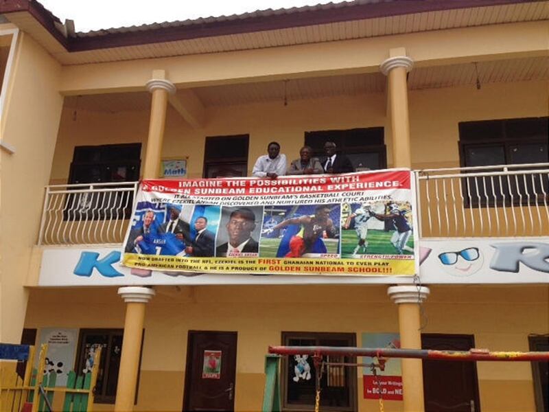 This week, Tanner and other Forever Young Foundation representatives from the United States returned to Accra. They visited Golden Sunbeam and immediately noticed a giant sign draped across the front of the school, touting Ansah's exploits as a football player. "It all started on Golden Sunbeam's basketball court," the sign exclaims, "where Ezekiel Ansah discovered and nurtured his basketball abilities."